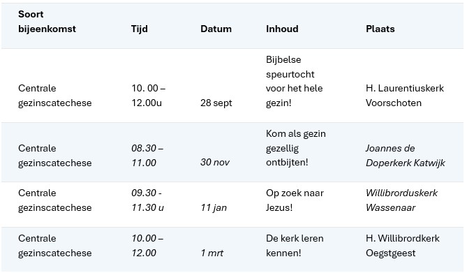 Een bijzondere activiteit is de Centrale Gezinscatechese. Vier keer per jaar zijn alle gezinnen uitgenodigd om een zondagochtend samen te komen voor een gezinsviering en catechese.